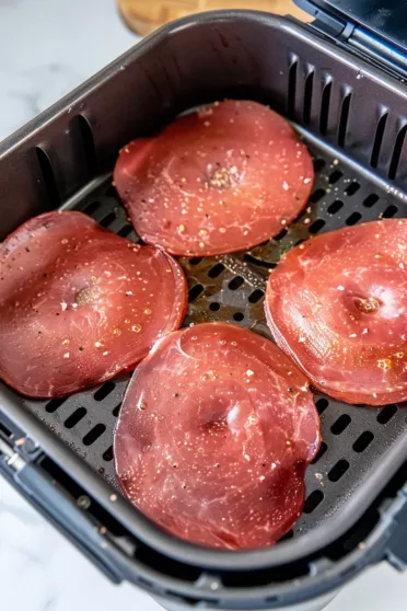 - Next place the bologna slices, in the air fryer basket ensuring they are not overlapping.