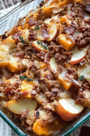 Butternut squash, apples, bacon, and pecans baked into a cozy fall casserole with honey and warm spices—comfort food at its finest.