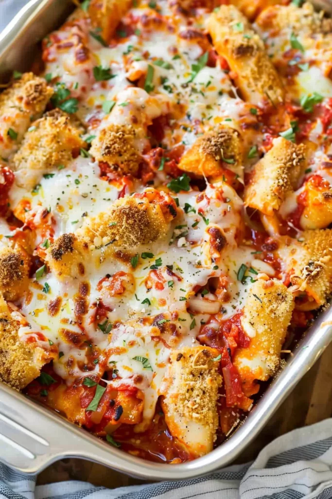 Here’s a little secret to making this Baked Chicken Parmesan Casserole extra amazing: Don’t skip the step where you pat the chicken dry! It might seem like a small thing, but it makes a big difference. Dry chicken equals crispy chicken because the flour and breadcrumbs stick better to dry surfaces. If your chicken is too wet, the breading will slide right off, and no one wants soggy chicken. Also, when you’re frying the chicken, make sure the oil is hot enough before adding the strips. A quick way to check is to drop a breadcrumb into the oil—it should sizzle immediately. If it doesn’t, give it a minute. And don’t crowd the pan! If you add too many pieces at once, the oil cools down, and instead of getting that nice golden crust, the chicken will just absorb the oil and end up greasy. Fry in batches, let each batch rest on paper towels to drain off the excess oil, and trust me, you’ll have the crispiest, most flavorful chicken ever. Oh, and one last thing—if you’re using store-bought marinara, taste it first and adjust the seasoning. Sometimes, a little pinch of salt or extra herbs can really elevate the flavor!