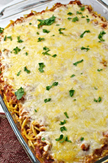The spaghetti is tossed with warm, melty cream cheese—yes, you heard that right—and then layered with savory meat sauce and topped with two kinds of cheese before it goes in the oven and comes out looking like something you meant to make.