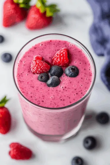 Frozen Mixed Berries: My mix usually has strawberries, blueberries, and raspberries. They give the smoothie that gorgeous magenta color — plus, they’re full of antioxidants (and let’s be honest, we all love that word even if we couldn’t define it in a quiz).