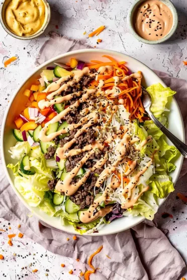 I remember my husband looking at the salad skeptically, asking, “Why is there beef in my lettuce?” But after one bite, his exact words were, “Oh wow, this actually does taste like a Big Mac!” Fast forward to today, and this salad has become a weeknight staple for us. It’s quick, easy, and satisfies that burger craving without making me feel like I’ve gone completely off track. Plus, the dressing? Chef’s kiss.