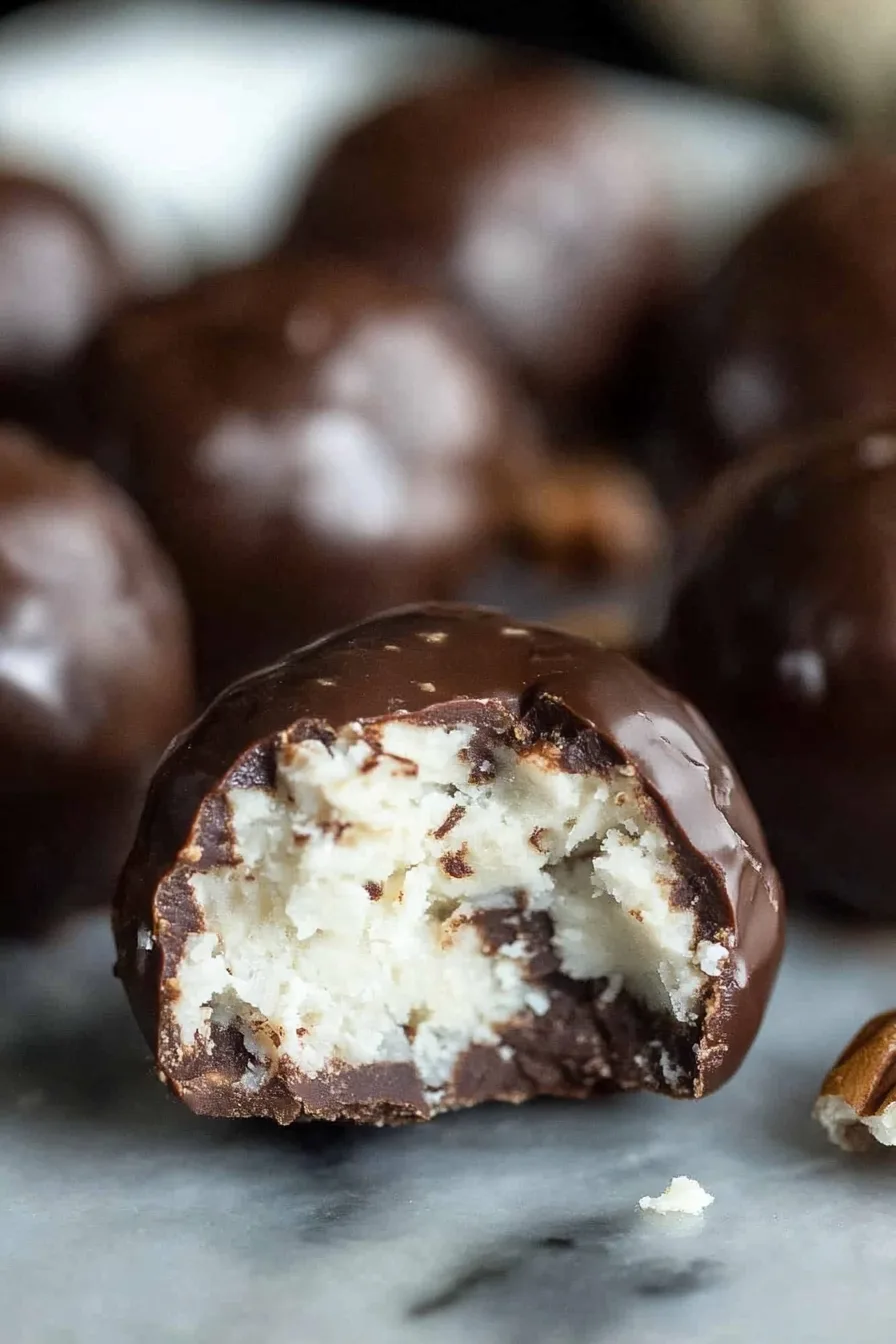 - While the chocolate is still soft, top each ball with a pecan half. Refrigerate until the coating is firm and set. Serve chilled.