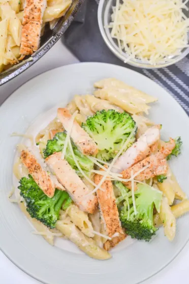 Step 9: Pile the broccoli over the pasta and place the chicken on top. Sprinkle with extra Parmesan cheese.