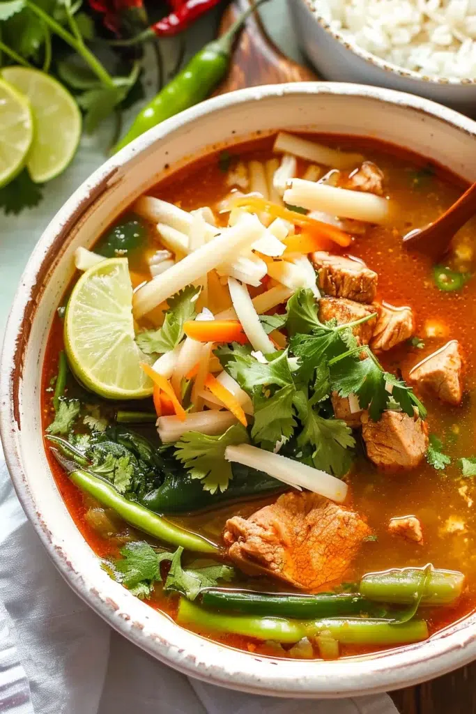 Ladle the soup into bowls and go wild with toppings—crispy tortilla strips, crumbled queso fresco, diced avocado, fresh cilantro, and a squeeze of lime.