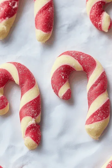 - When ready to bake, preheat the oven to 375°F (190°C). Line two baking sheets with parchment paper or silicone mats. Pinch off walnut-sized portions (approximately 2 tablespoons) of each dough color. Roll each into a rope about 6 inches long. Place one red rope and one plain rope side by side, press together at the top, and twist to form a spiral. Curve the top into a candy cane shape. Arrange on the prepared baking sheets. If the dough becomes difficult to handle, return it to the refrigerator to chill briefly.