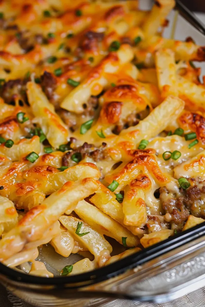 Pour the beef mix into a 9×13 casserole dish. Sprinkle a generous handful of shredded cheese on top. Then arrange the fries over everything like the crispy crown they were born to be.