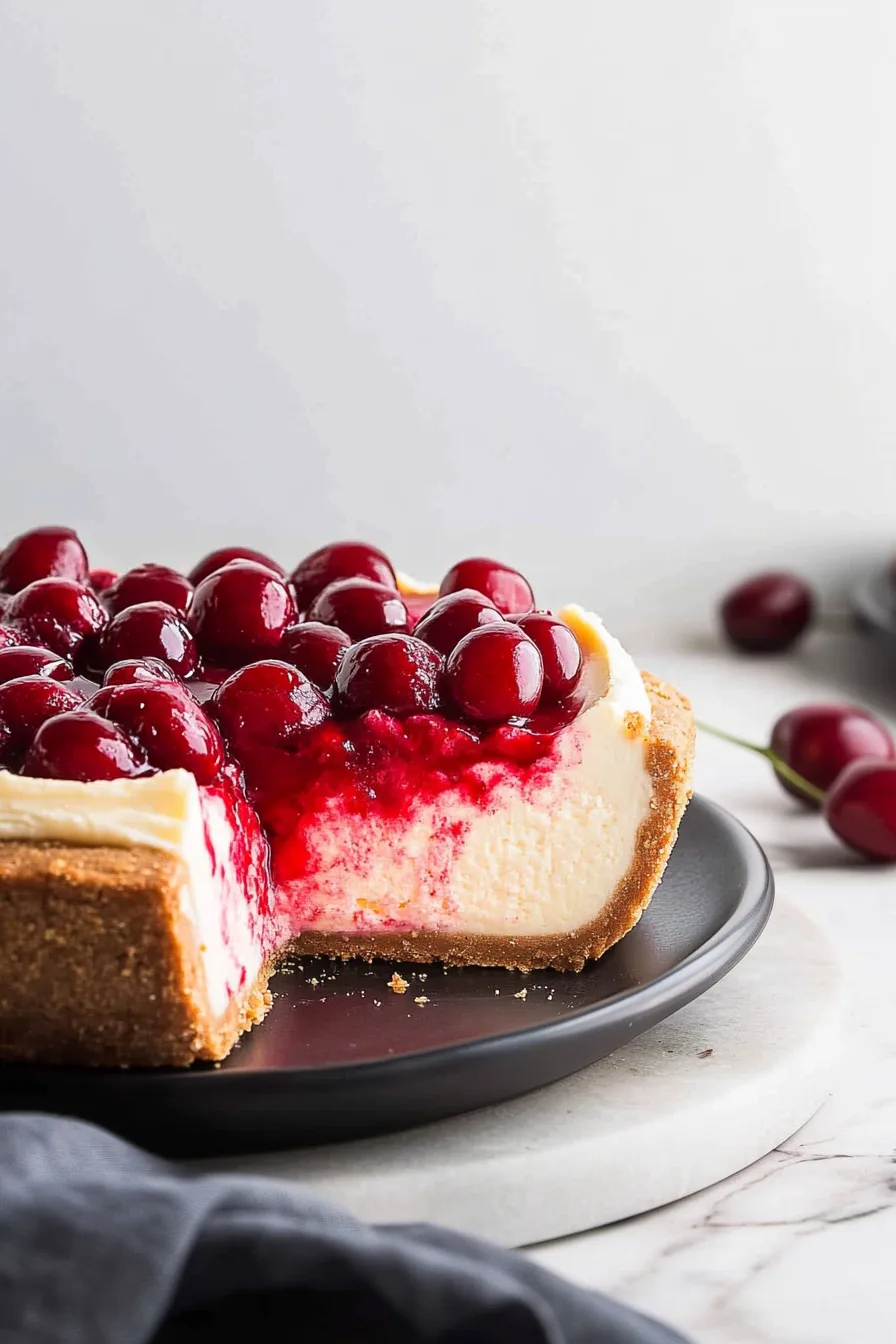 This cheesecake is a fridge-lover. Wrap it up and keep it chilled for about 4–5 days. If you want to plan ahead, freeze it (without the topping) and thaw overnight in the fridge before serving. Then add cherries and you’re golden. It’s honestly even better the next day after the flavors settle.