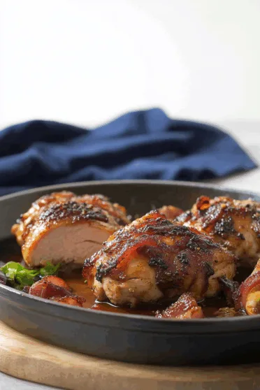 - Transfer the baking dish to the oven. Bake for 25–30 minutes, checking at 20 minutes and again at 25 minutes to avoid overcooking. The chicken should reach an internal temperature of 165°F (74°C), with the bacon crisp and the sugar caramelized.
