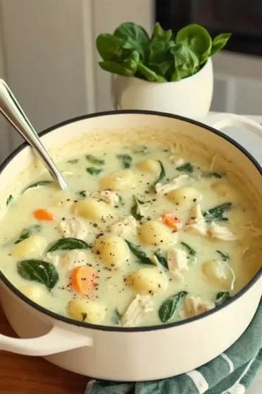 Add the gnocchi straight into the pot. Bring the soup back to a simmer and let it cook for 5–6 minutes, stirring gently. The gnocchi will float to the top when they’re done, which is your cue to move on. - Add the Chicken and Spinach: