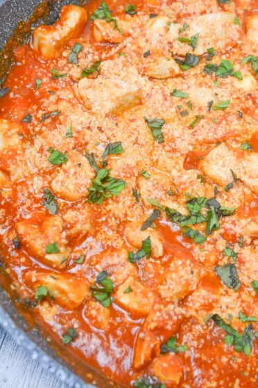 - Adjust the heat to low, then add the marinara sauce, red pepper flakes, and water. Stir well. Return the chicken to the pan. Stir in the parsley and let everything simmer for about 7 to 8 minutes, stirring often.