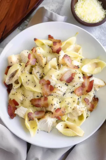 Mix the cooked chicken with the Alfredo sauce and gently stir it into the pasta. Sprinkle in half the mozzarella and cheddar cheese (because layers matter). Crumble that crispy bacon over the top like a pro.