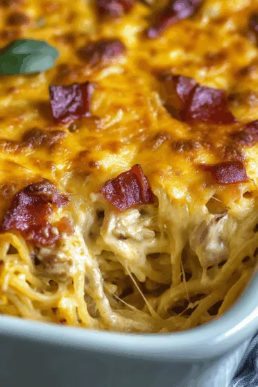 - Now grab your baking dish. Add the cooked spaghetti and shredded chicken, then pour the cheesy sauce over everything. Mix it all together until it’s evenly coated. Sprinkle cheddar and bacon bits over the top like you’re decorating the world’s cheesiest Christmas tree.