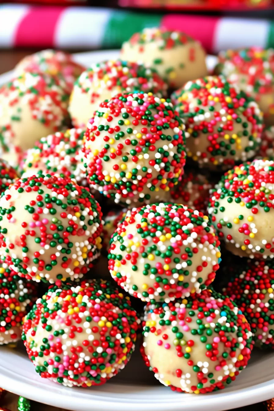 Scoop out about 1½ tablespoons of dough and roll them into balls. Now, get those sprinkles out. Roll the dough balls in sprinkles until they’re covered in holiday cheer.