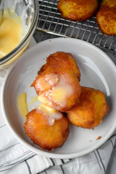 Step 9: Glaze Fritters: Once the fritters have cooled slightly. Dip them into the glaze. Place the glazed fritters on a wire rack set over a baking sheet. To allow excess glaze to drip off.