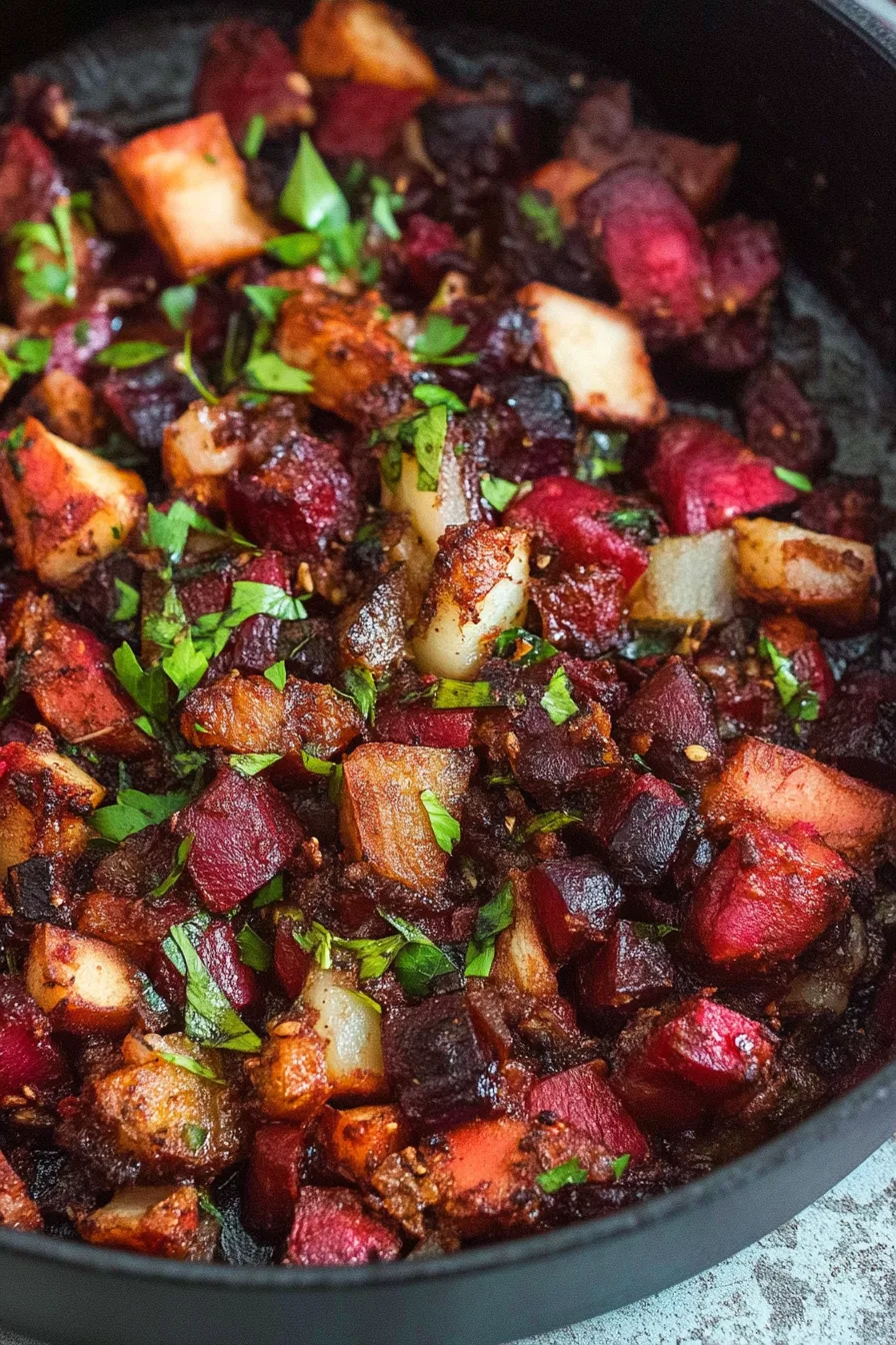 What I adore about Classic Red Flannel Hash—and I mean adore, in the “I’ll eat the crispy bits from the pan with a fork while standing at the stove” way—is how humble it is. It’s not glamorous. It’s not photogenic unless you love magenta beets staining everything like an enthusiastic toddler with a marker. But it tastes like comfort and simplicity and that old style of cooking where recipes weren’t printed anywhere; they were just “what we do.”