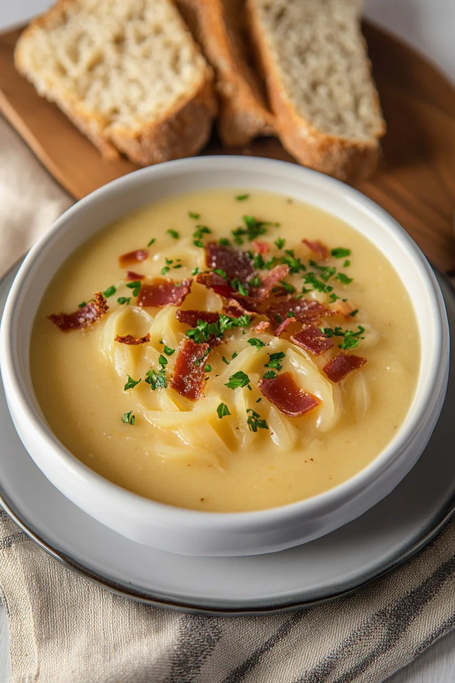 The onions melt down into sweetness, the broth soaks up that creamy sauce, and then there’s the cheese. Cheddar for a little sharpness, Velveeta for smoothness. (Yes, I know, Velveeta divides people. But in this soup? It just works. Don’t fight it.) Garnish with bacon if you’re feeling extra—it’s not traditional, but who’s keeping track?