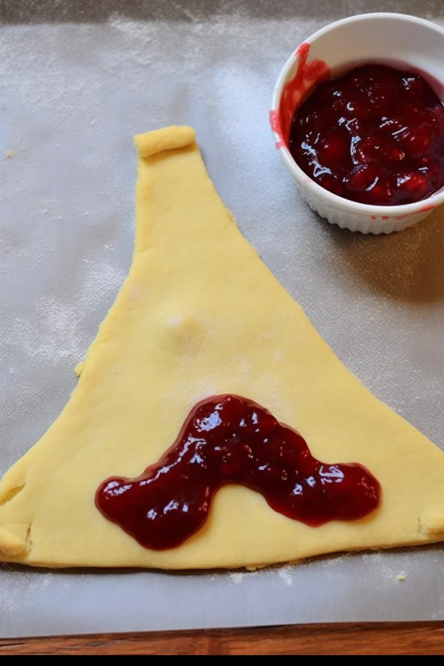 - Spoon about a half tablespoon of cranberry sauce onto the wide end of each triangle. Don’t overdo it—unless you want it oozing like a lava flow, which, okay, still tastes great, just messier.