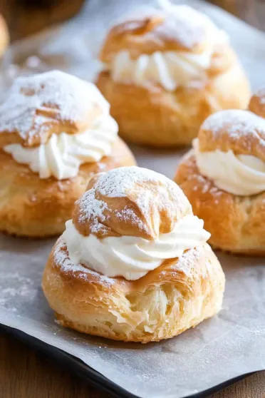 Whip up these delightful cream puffs with butter, eggs, cream, and vanilla. A light, airy treat filled with creamy, dreamy goodness!