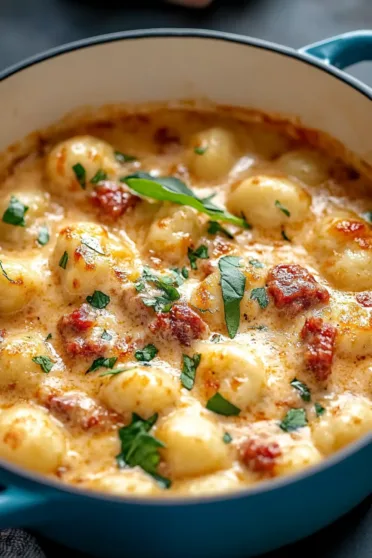Next up: garlic. Let it do its thing for a minute before adding the chicken stock, tomato paste, and cream cheese. Lower the heat and stir until the sauce turns into this creamy, velvety masterpiece. Don’t rush it—good things take time (even if it’s just a couple of minutes). - Cook the Gnocchi