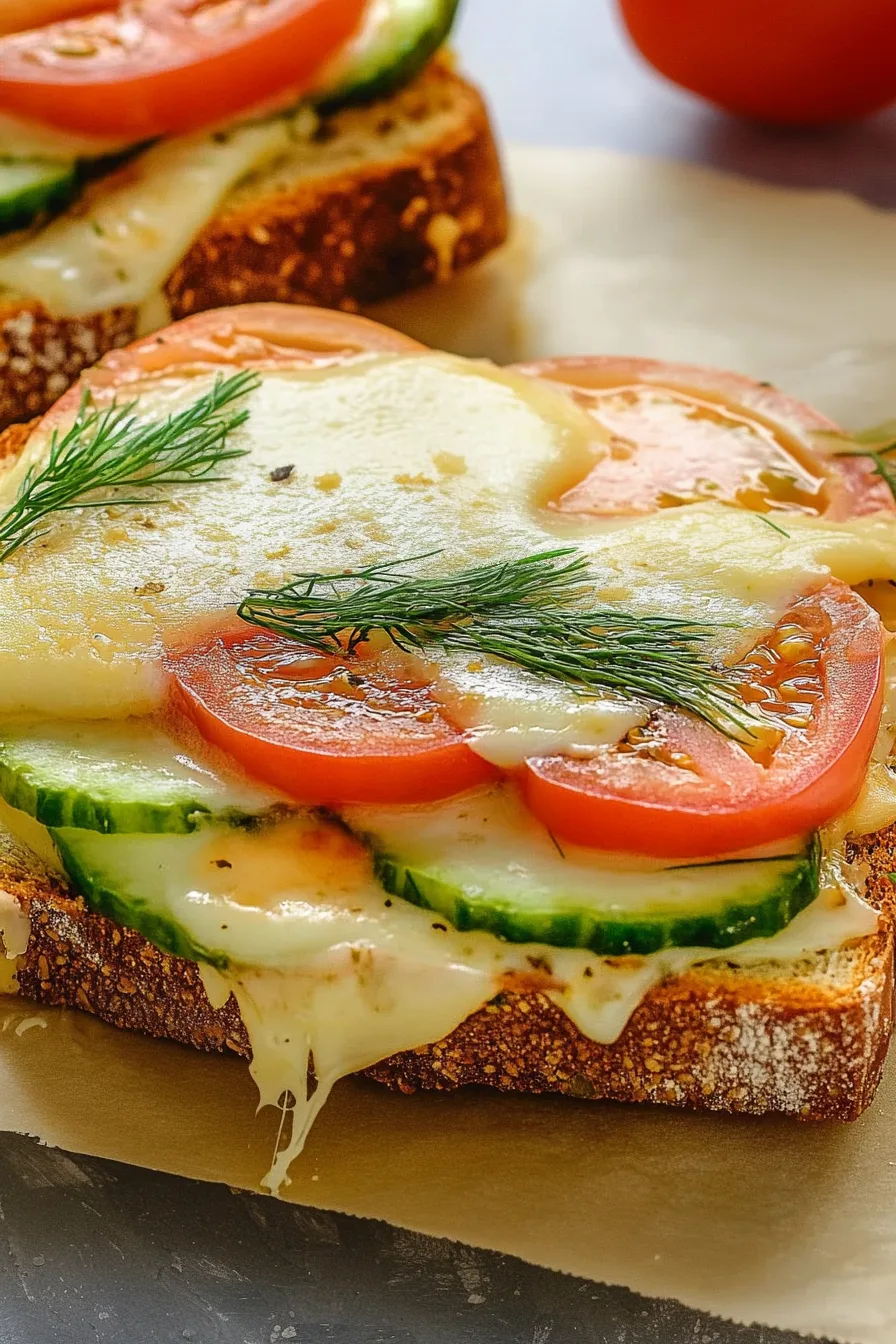 Place the bread on a baking sheet. Then stack: turkey → cucumber → tomato → Havarti. This order matters more than you’d think. The turkey gives the veggies a place to sit, and the cheese melts down into everything like a cozy weighted blanket.