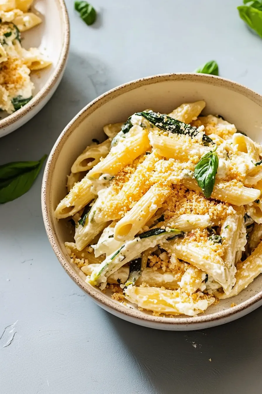 Creamy Zucchini Ricotta Pasta made with ricotta, zucchini, lemon, olive oil, penne, and crispy breadcrumbs for a silky, bright, comforting meal.