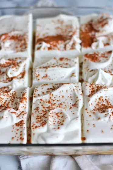 Step 8: Once your cake has chilled. Frost it with the coconut whipped cream. And sprinkle cinnamon on top. If you like. Chill again before serving.