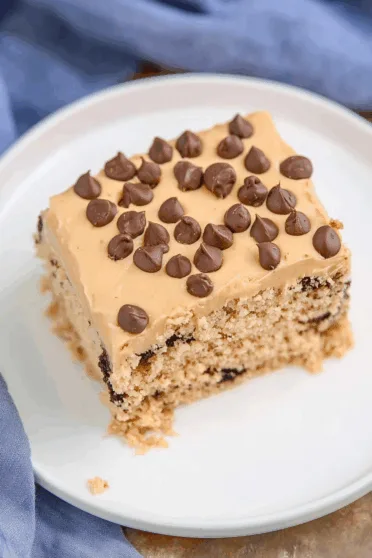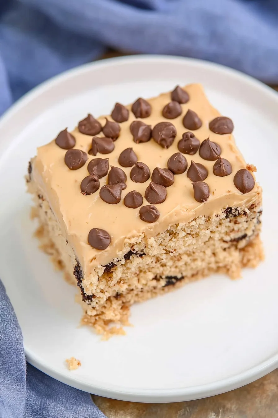 Once the cake is completely cool, spread that dreamy peanut butter frosting over the top of the cake. Don’t skimp on the frosting—be generous! Finally, sprinkle mini chocolate chips over the top for that extra pop of sweetness and crunch. Trust me, this is where the magic happens.