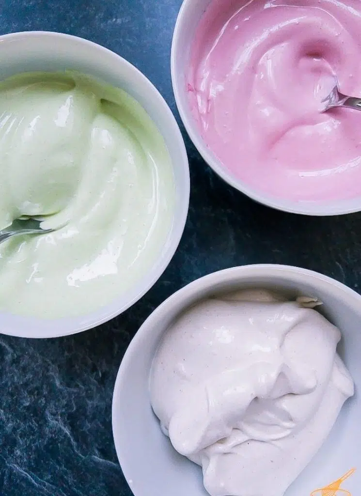 - Now divide the finished mixture into three small bowls to color it. One remains white/beige—the beige color results from the gingerbread essence I used, which gives a brownish touch. The other two are getting the color green and pink.