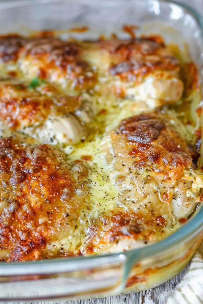 Bake the chicken in your preheated oven for 45 minutes to an hour, or until the chicken is cooked through (165°F if you’ve got a meat thermometer) and the topping is golden and bubbly. Let it rest for a few minutes before serving—it’s worth the wait.