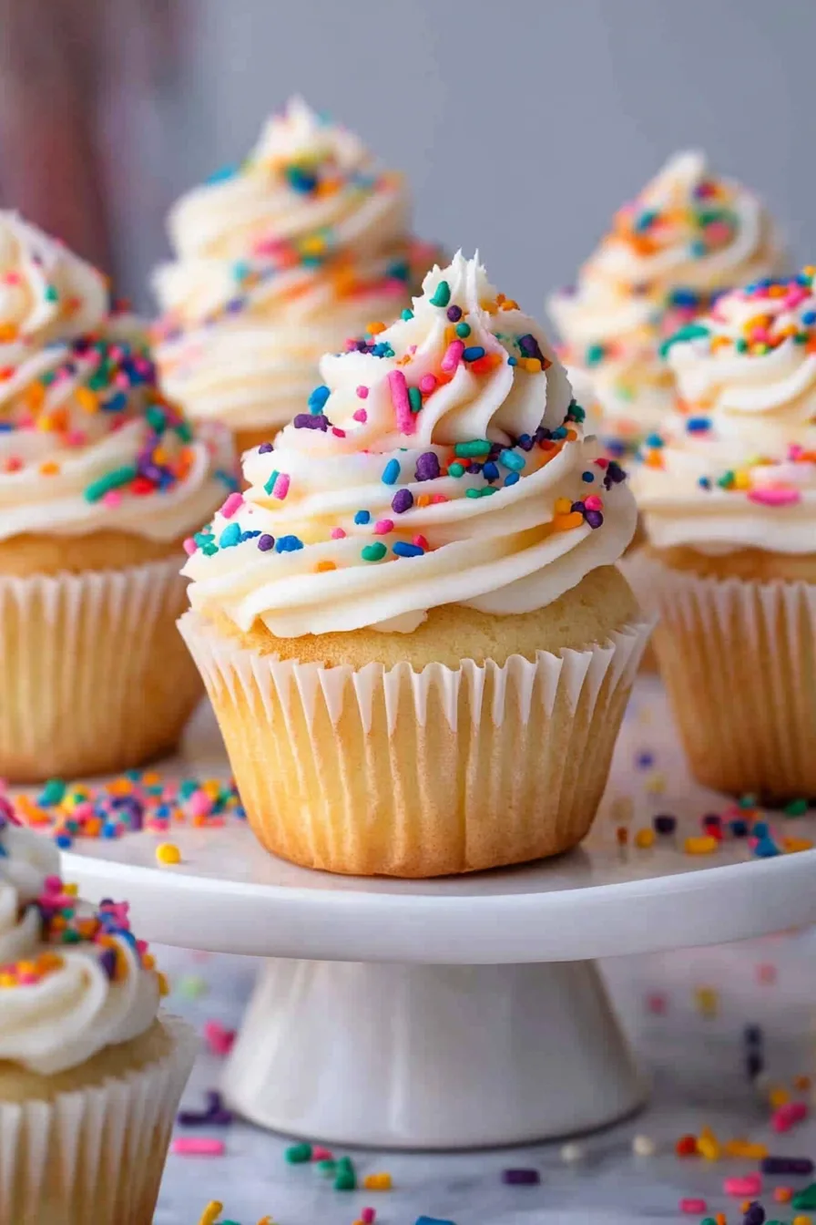 Soft vanilla cupcakes made with cake flour, rainbow sprinkles, and fluffy vanilla buttercream. Funfetti joy baked from scratch—no box mix needed.