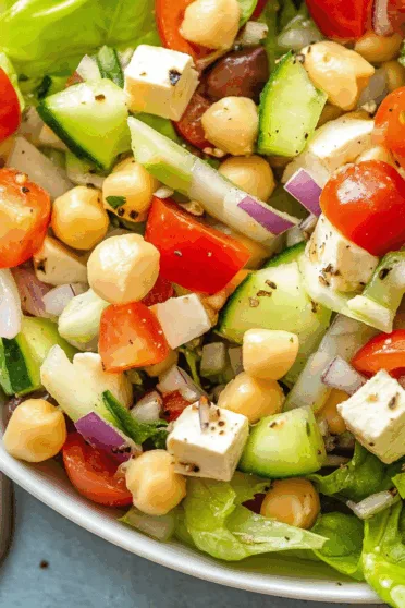 - Place the chopped romaine lettuce, sliced cucumber, diced plum tomato, chickpeas, cubed cheddar cheese, and thinly sliced onion into a large serving bowl. Mix lightly to distribute the ingredients evenly.