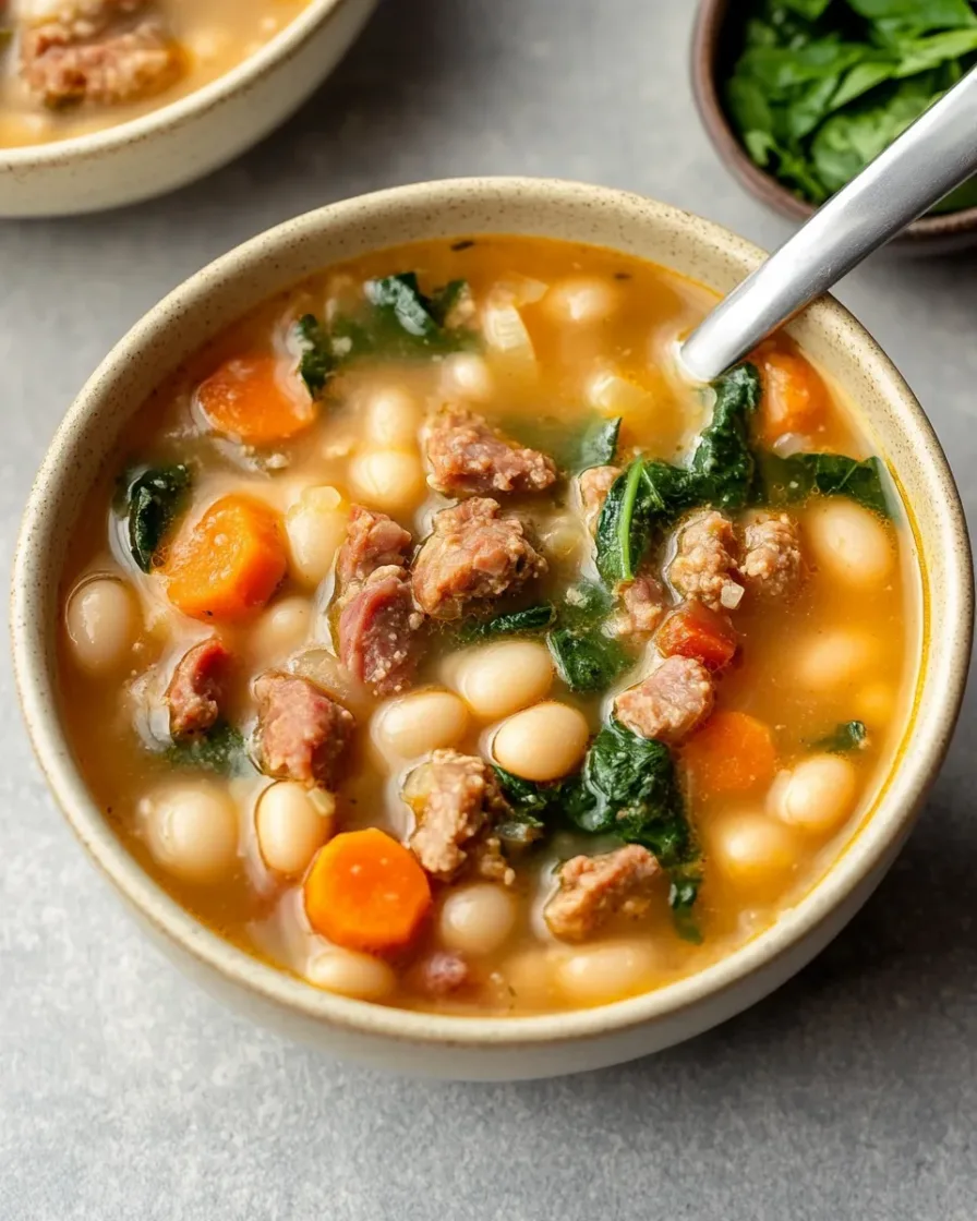 The first time I made this Italian Sausage White Bean Soup. It was a chilly evening. And I wanted to prepare something warm. And filling. For my family. As the aroma of sautéing sausage. And garlic filled the kitchen. My husband and child wandered in. Drawn by the irresistible smell. The rich, savory flavors. Combined perfectly with the creamy beans. And fresh spinach. And it quickly became. A household favorite. Now, whenever the weather starts to cool. They always request this comforting dish.