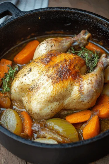 - Once fully cooked, remove the chicken from the pot and allow it to rest briefly. Carve into serving pieces or present whole on a platter surrounded by the roasted vegetables. Serve alongside the potatoes, spooning the rich pan juices over each portion.