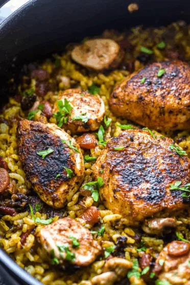 Smoky sausage, juicy chicken thighs, peppers, onions, and rice all in one pot—this One-Pot Chicken & Dirty Rice Recipe is comfort food made easy.