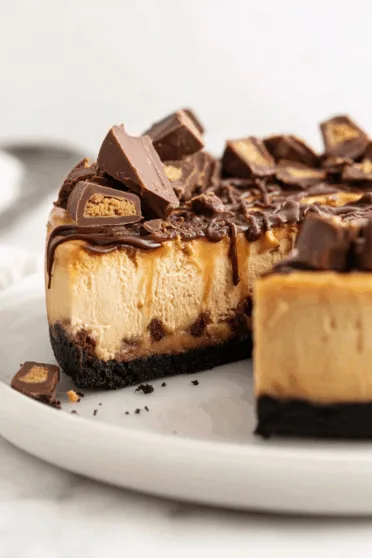 - Once the ganache has been added, you may optionally garnish the cheesecake with chopped peanut butter cups, Oreo pieces, or whipped cream. Chill for an additional 30 minutes to allow the ganache to set before slicing and serving.
