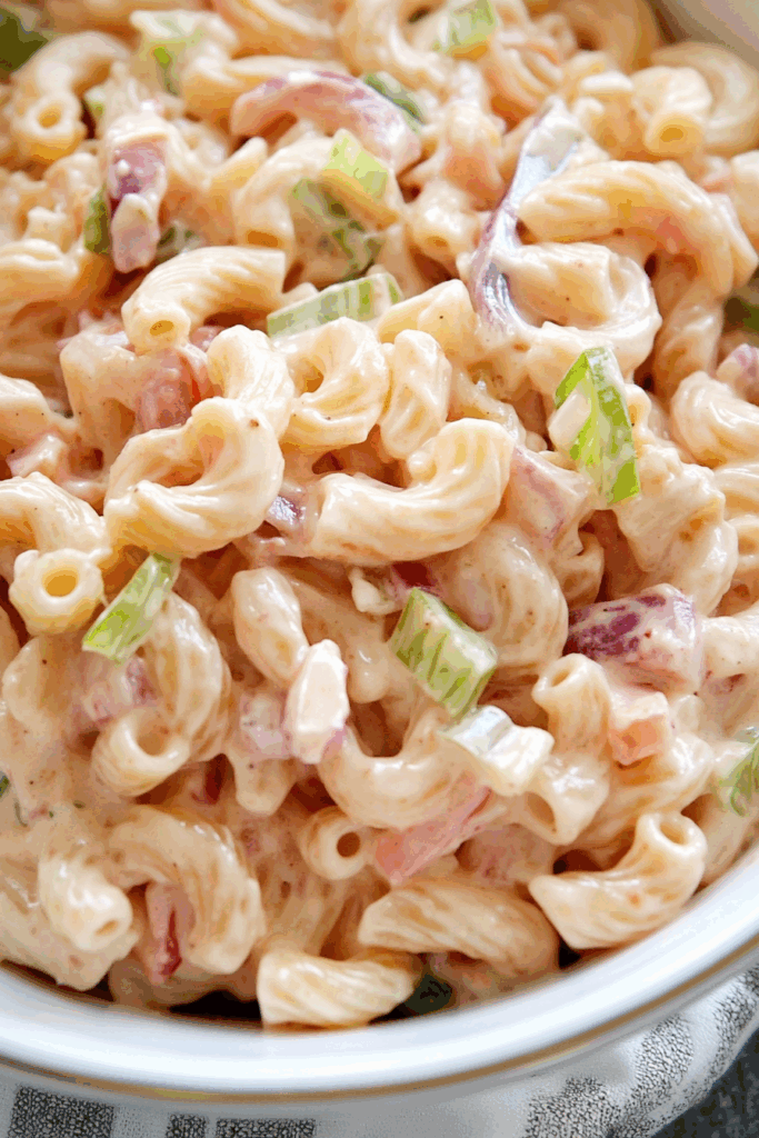 The dressing? Catalina—yeah, that ‘70s classic nobody admits they still love. But with mayo, it becomes this glossy, velvety pink sauce that just clings to every elbow noodle like they’re dancing. And the relish? That’s the plot twist. One little scoop and suddenly everyone’s like, “Wait, what is this?!” It’s nostalgic and new. And honestly, I still can’t totally explain it… it just works.
