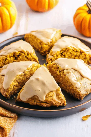Pumpkin scones with pumpkin puree, cinnamon, pumpkin spice, butter, brown sugar, and maple glaze—warm, flaky, and perfectly autumn.