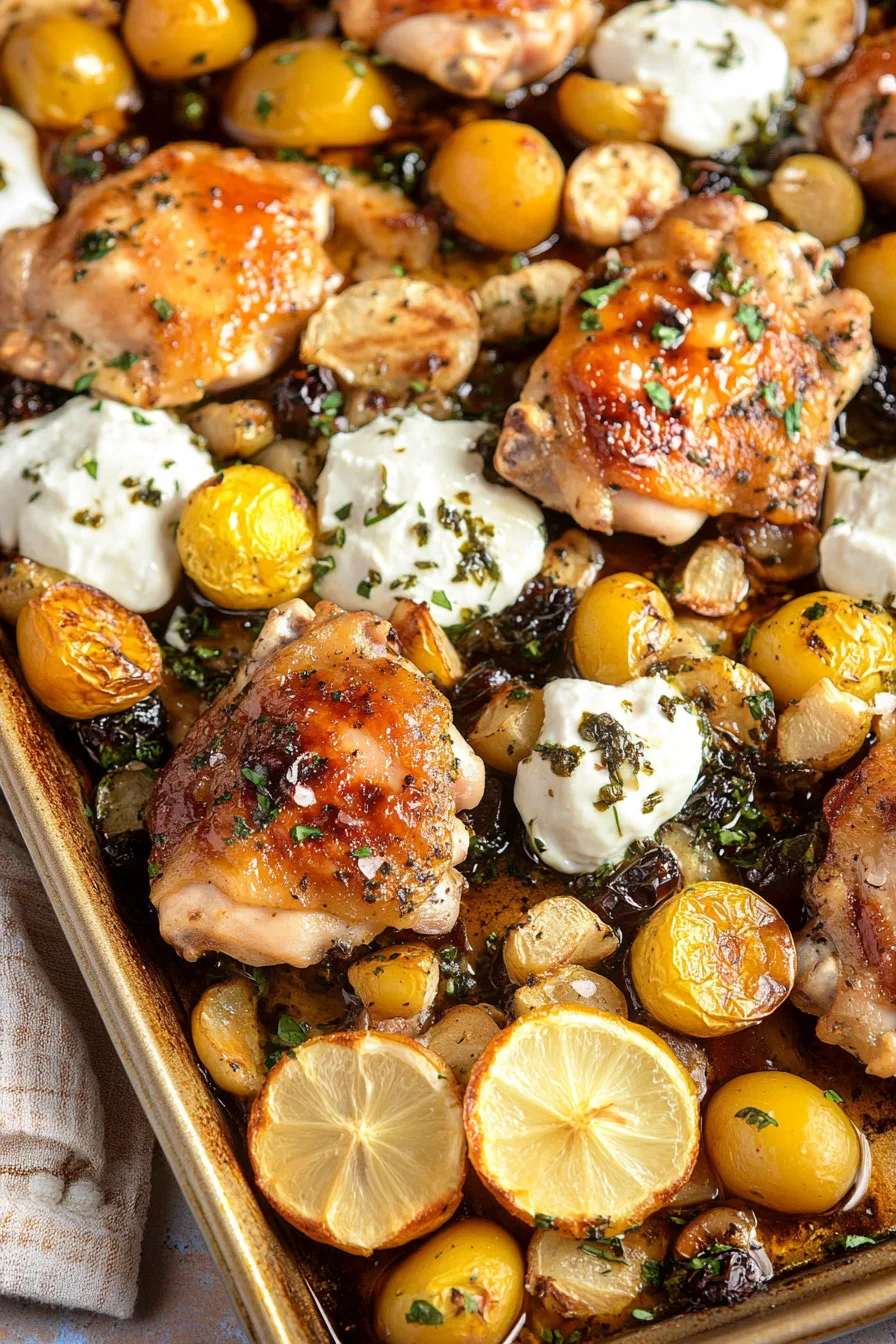 Roasted Lemon Balsamic Chicken and Potatoes made with chicken thighs, potatoes, balsamic vinegar, olive oil, Dijon, olives, lemon, tzatziki, and feta.