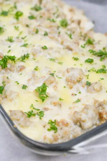 Step 10: The gravy should be creamy, not thick or runny. As it bakes, it will thicken. To keep the gravy creamy, add milk.