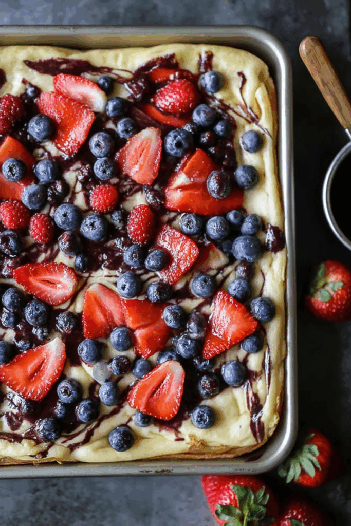 First, can we talk about the genius of making one big pancake? Instead of flipping 18 small ones and keeping them warm (which, let’s be honest, never really works), you just pour the batter in a pan, throw on toppings like you’re a breakfast Picasso, and bake. That’s it.