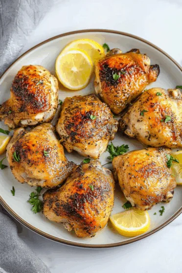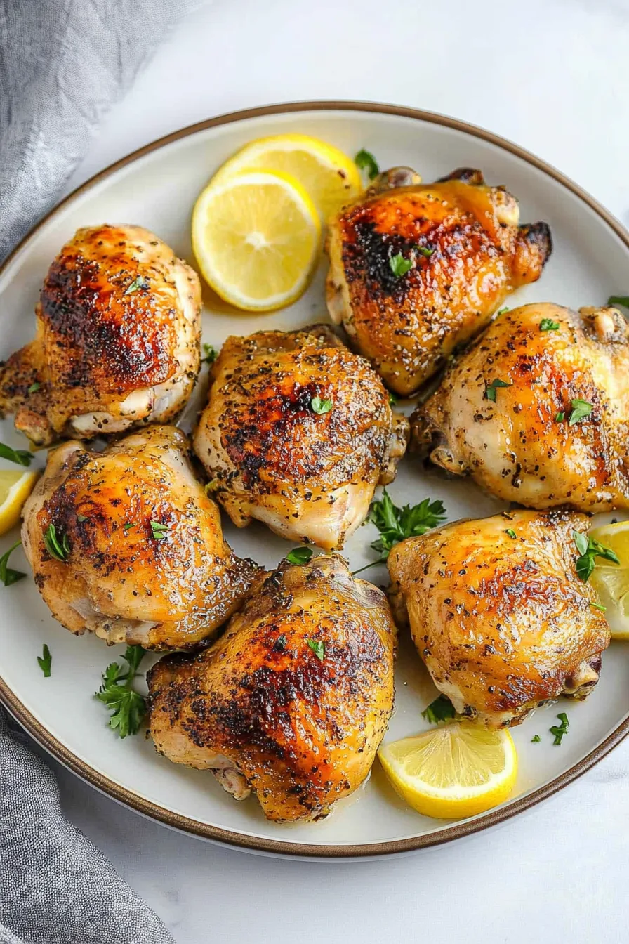 Let the chicken rest for about 5 minutes. Then spoon those softened lemons, garlic pieces, and pan juices right over each thigh. That’s the good stuff — do not skip it.