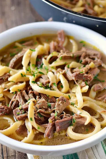 Here’s a little trick to make this recipe even better—let the beef rest in the slow cooker before adding the noodles. Once the beef is shredded and you’ve added the broth, let it sit on LOW for an extra 30 minutes to really soak up all that flavor. It’s tempting to rush, but trust me, this extra step takes the taste to another level. And if you want a richer broth, swap out some of the water for more beef broth or even a splash of red wine for a deeper flavor. Oh, and one last thing—if you love a thicker sauce, you can mix a tablespoon of cornstarch with a little cold water and stir that into the broth before adding the noodles. It’ll thicken everything up perfectly.