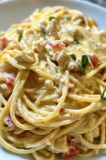 Toss the shredded chicken back into the slow cooker. Add the drained spaghetti and give it all a good mix so everything’s coated in that creamy sauce.