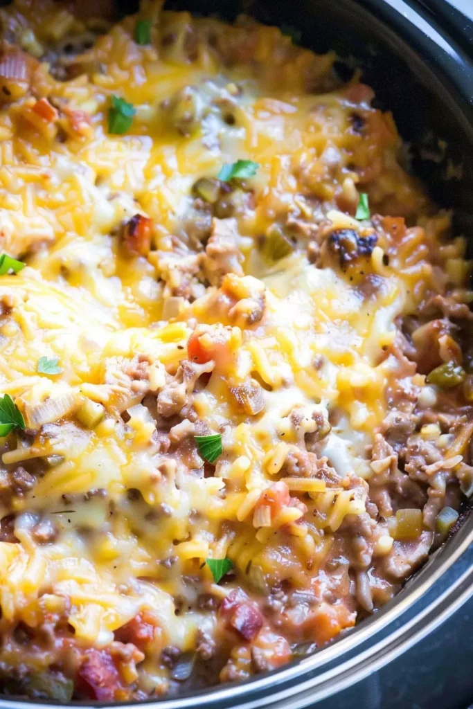 If you want to kick this Slow Cooker Kitchen Sink Casserole up a notch, try layering the flavors even more. When you brown the ground beef, don’t just season it with salt and pepper—toss in a splash of Worcestershire sauce and maybe even a dash of smoked paprika. This adds a deeper, richer flavor to the beef. Oh, and don’t forget to mix in a little extra cheese when you layer it—because more cheese never hurt anyone, right? Finally, if you’re worried about the rice getting too mushy, you can add it during the last two hours of cooking instead of at the start. This way, it’ll still absorb all those amazing flavors but stay a little firmer.