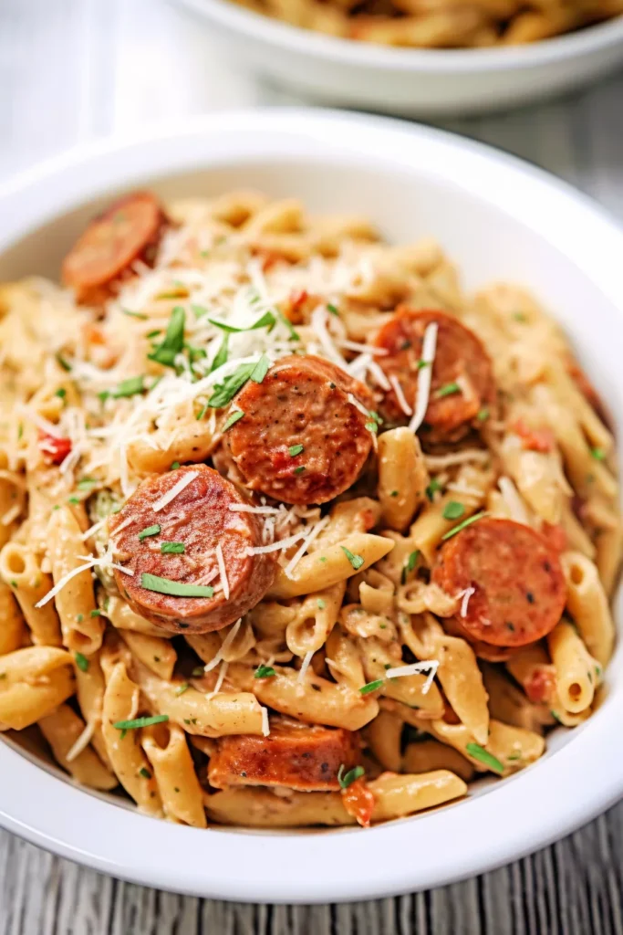 Smoked Sausage Cajun Alfredo – Indulge, in the world of our Smoked Sausage Cajun Alfredo, a recipe that combines the richness of turkey smoked sausage with an Alfredo sauce infused with flavorful Cajun spices. This delightful dish features ingredients such as cream, pasta, and grated Parmesan cheese guaranteeing a treat that will leave you longing for more.