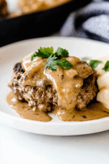 - Remove from heat and allow to rest for 5 minutes. Serve hot, with gravy spooned generously over the hamburger steaks.