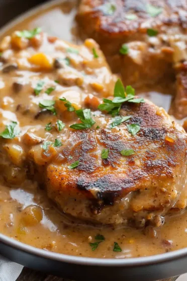Lightly dredge each pork chop in flour, shaking off the excess. Heat olive oil and butter in a skillet over medium heat. Once the pan is hot, sear the chops for 3–4 minutes per side until they’re golden brown and beautiful. Set them aside on a plate—they’ll finish cooking in the gravy.