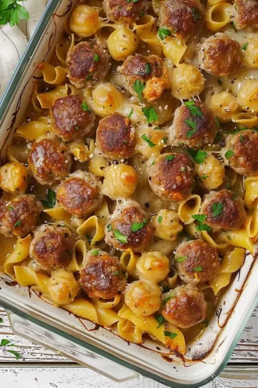 Grease a 9×13 baking dish. Spread the cooked egg noodles evenly, nestle the meatballs right on top, and pour that dreamy sauce all over everything.