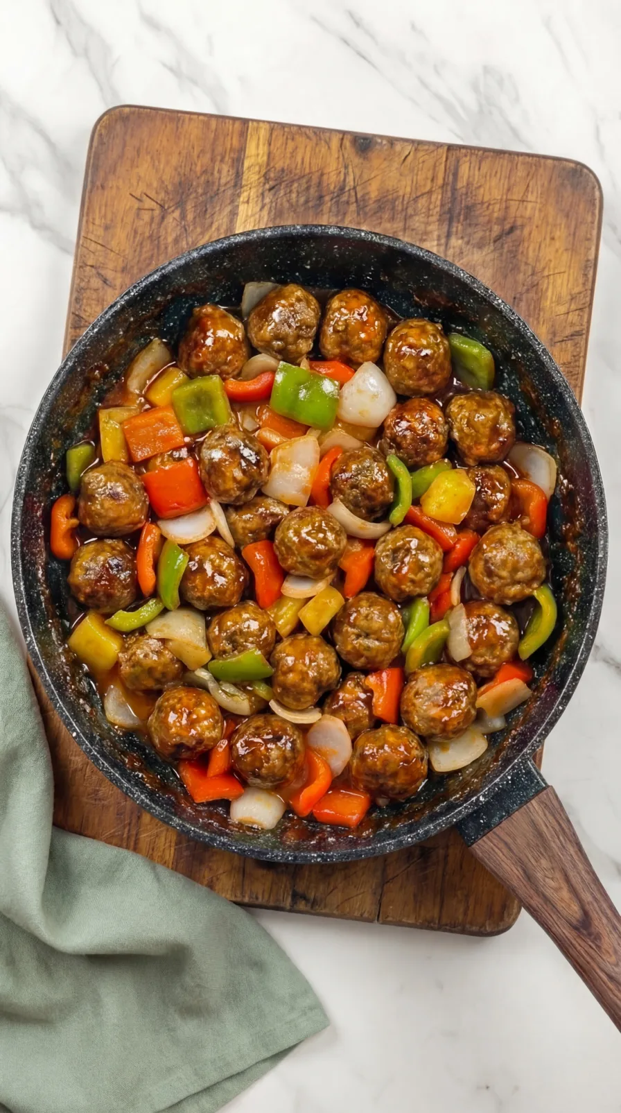 sweet and sour meatballs with ground beef, onion, bell peppers, pineapple, and ketchup sauce. Sticky, tangy, and weeknight-friendly in the best way.